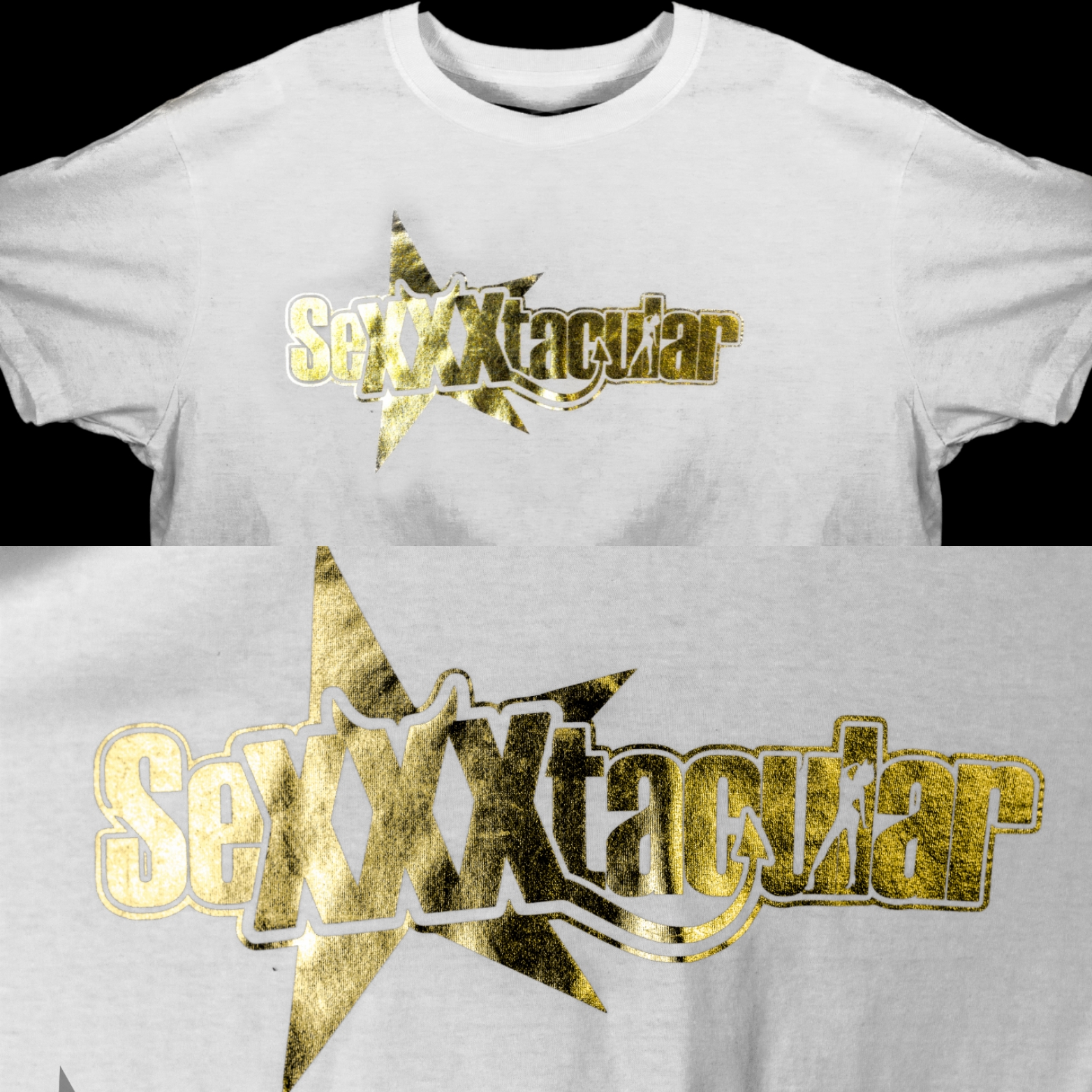 SEXXXTACULAR SIGNATURE LOGO WHITE TEE W GOLD MATALLIC LOGO (UNISEX)